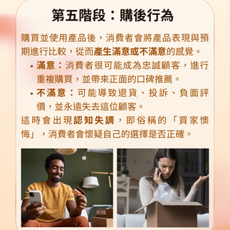 內容:購買並使用產品後,消費者會將產品表現與預期進行比較,從而產生滿意或不滿意的感覺。